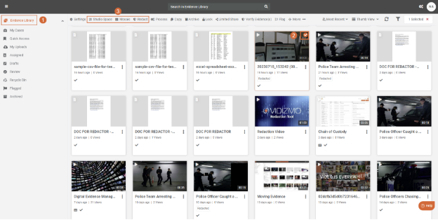 - Browse through the list of media files and identify the specific one you want to redact. Click on the file to highlight it and activate the available options.
