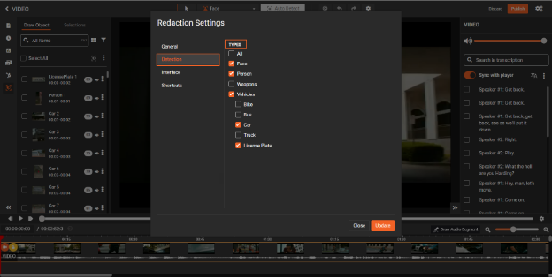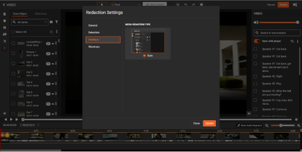 - Specify redaction types for audio and video content.