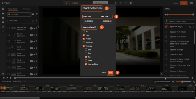 Choose from various detection options, such as detecting all objects, faces, persons, weapons, or vehicles.