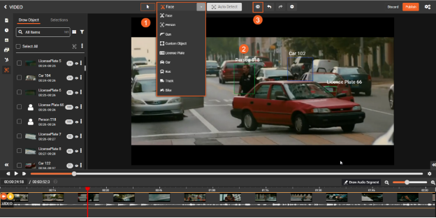 After selecting the desired objects, click on the Redact icon. The detected objects will be redacted according to the redaction type specified in the General Settings during the configuration.