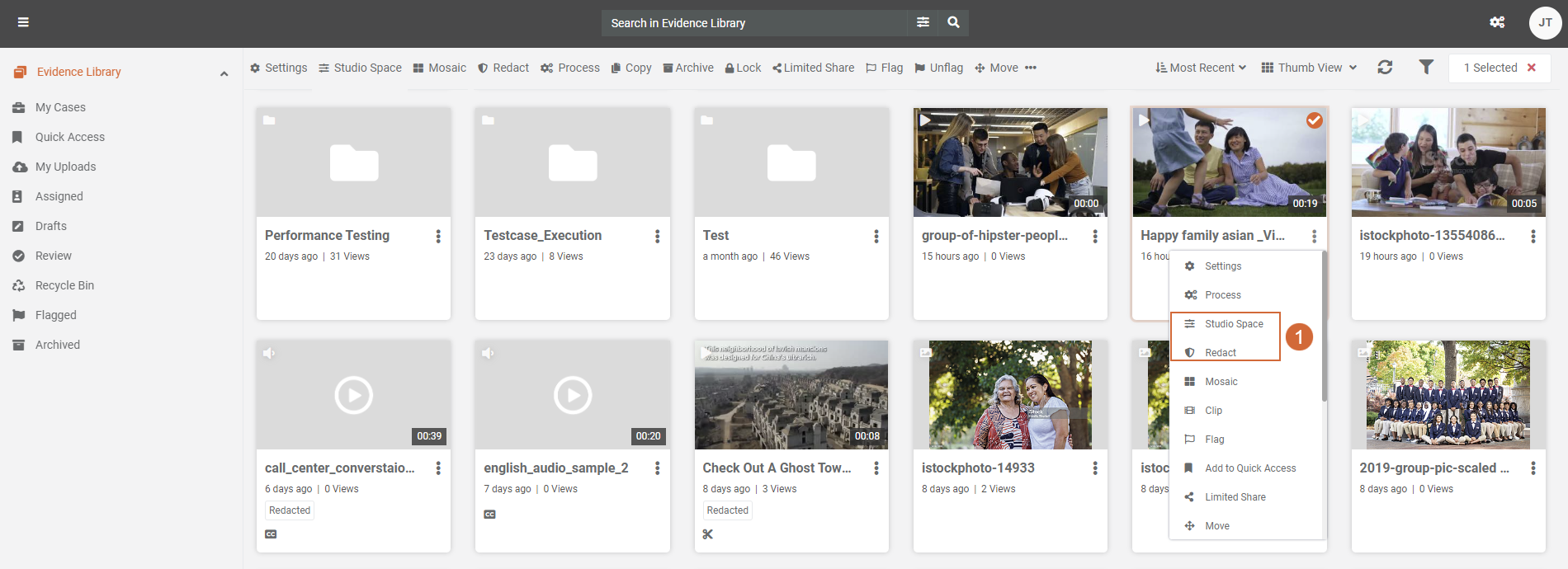 - Access the desired media file by clicking the overflow menu and selecting Studio Space or Redact option. Alternatively, choose the media file and utilize the top options, selecting either Studio Space or Redact to open the media file in Studio Space.