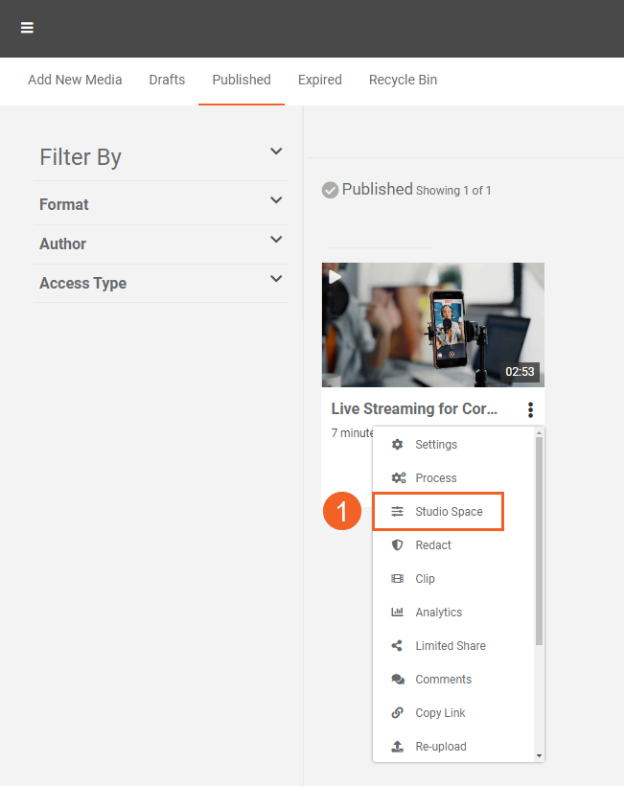 - Select ‘Studio Space' from the overflow menu of your content to open it in Studio Space.