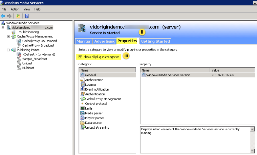 You can also manually configure the VIDIZMO streaming server running on a Windows 2008 R2 Server to improve the overall QoS by modifying plug-ins or properties in the category in the Windows Media Services.