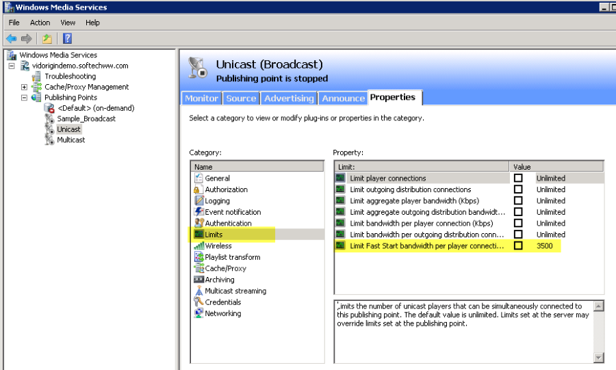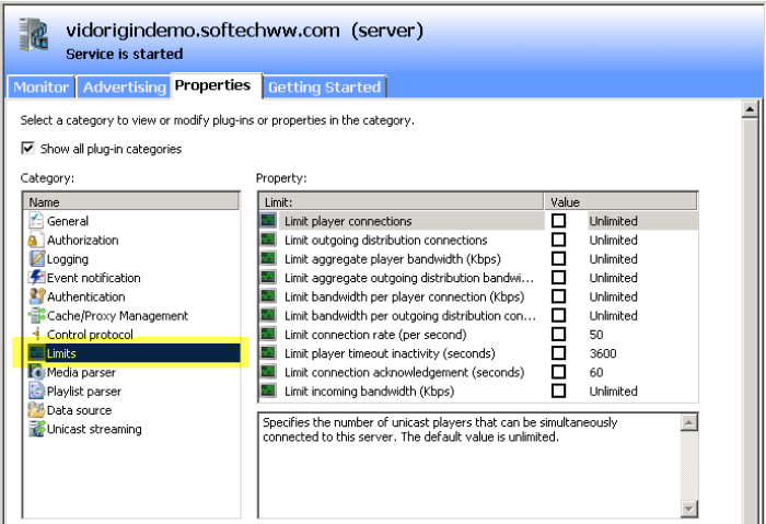 - Next, click on the Limits category. A list of properties will be displayed on the right-hand side. It is normally recommended that customers put limits depending on the amount of bandwidth committed on the streaming server or how many NICs have been installed on the machine.