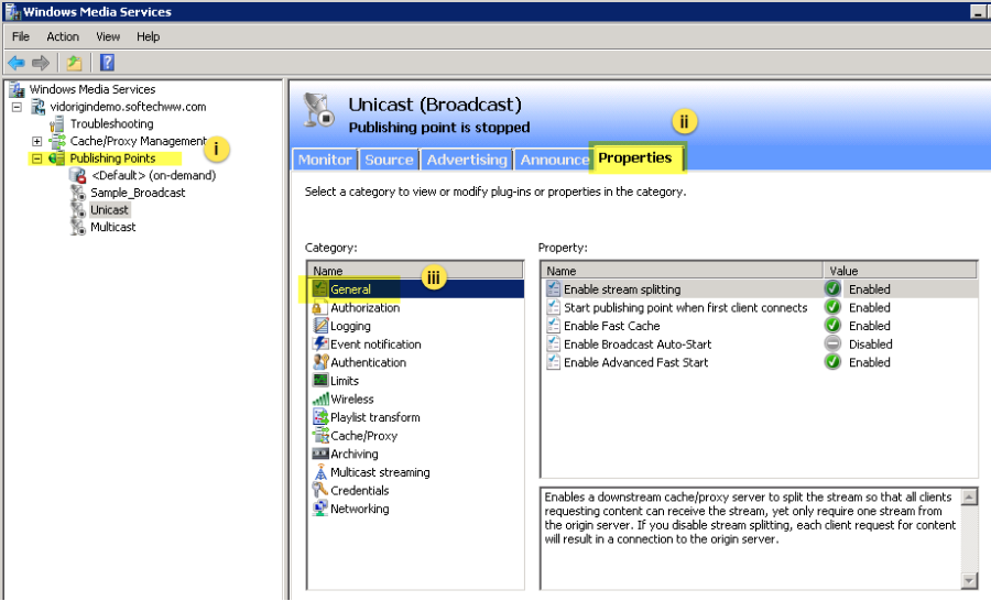 i. Click on the Publishing Points to bring up its options and properties