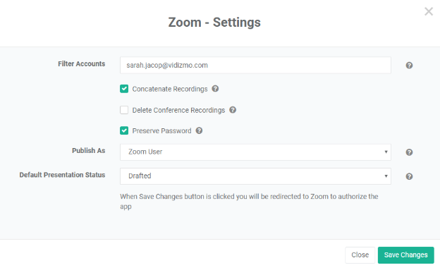 - Make sure to authorize every Zoom account or sub-account with unique administrative credentials in each VIDIZMO portal. E.g. VIDIZMO portal A should be synchronized with Zoom account ABC using "jack@lexcorp.inc" whereas portal B should be synchronized with the same Zoom account ABC using "sarah@lexcorp.inc", condition that both Sarah and Jack are users with administrative privileges within the Zoom account ABC.
