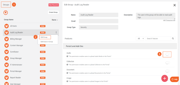 This feature is available at the group level and is generally related to portal management. Global Group Features are enabled by default in pre-configured (default) groups, and these default settings cannot be disabled. Each default group includes specific features aligned with its designated use case. For example, the Audit Log Reader group has the Audit Log feature enabled by default, allowing users in this group to access audit logs in the portal. If additional access is required, more features can be enabled within this group as needed.
