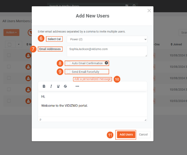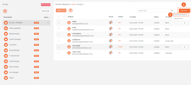 Add multiple users via email address by following the same initial steps as adding a single user outlined in the preceding section.