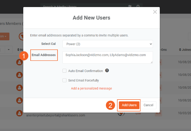 - In the Add New Users dialog box, enter multiple email addresses, separated by commas.