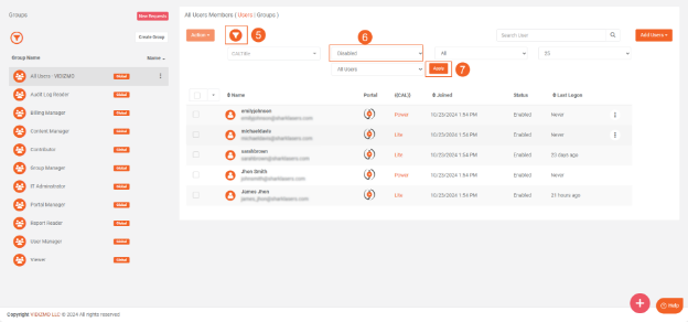 To re-activate users, you can enable them in the portal if they are disabled. To learn about Users & Groups, see Understanding User Management.