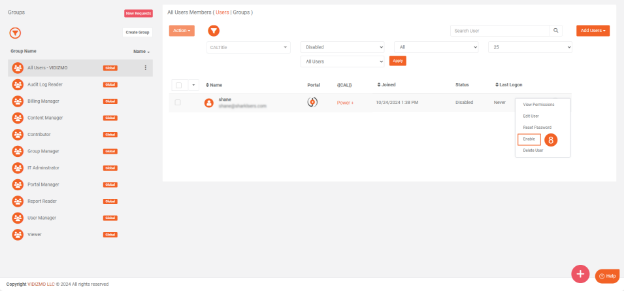 - Only users with access rights to the user management group can enable other users in the portal or if their group has user management feature permission enabled.