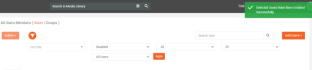 A notification will be displayed briefly stating: Selected users have been enabled successfully.