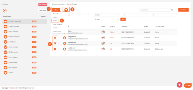 Utilize the bulk option on the User and Group page to enable users efficiently. Follow the steps below.