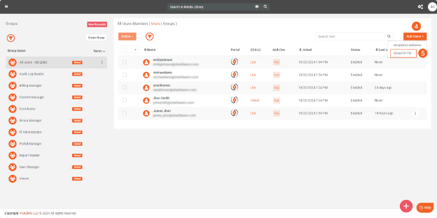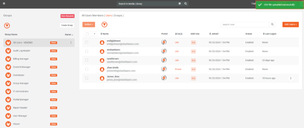 VIDIZMO allows bulk user import, replacing the tedious process of adding users one at a time. This feature enables the import of new users in bulk and assigns them to any desired group. The bulk import uses a CSV file that transfers all user metadata.