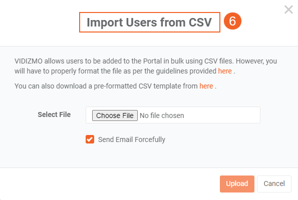 - A popup modal titled Import users from CSV will appear, featuring the following components.