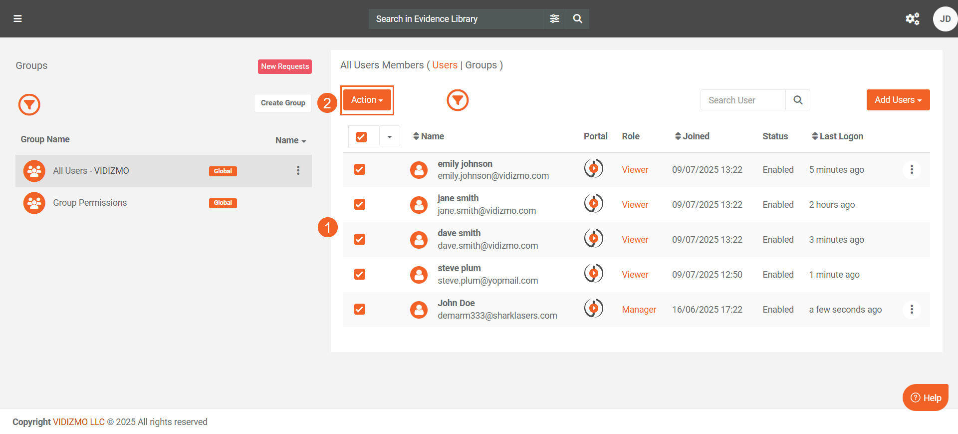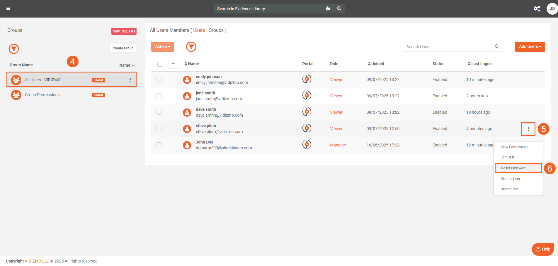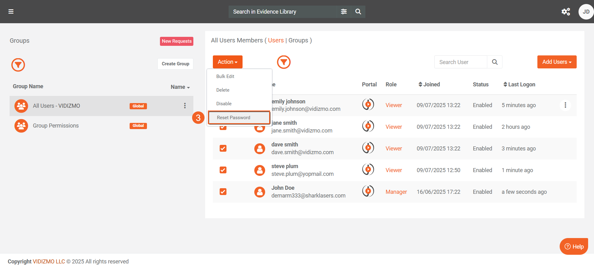 In a VIDIZMO Portal, users with the user management permissions (assigned either through a group or via CAL)—can reset passwords of other users as needed. Password resets can be performed for individual users or for multiple users at one time. Once the reset process is initiated, an email containing a link to reset the password is sent to the selected user(s).
