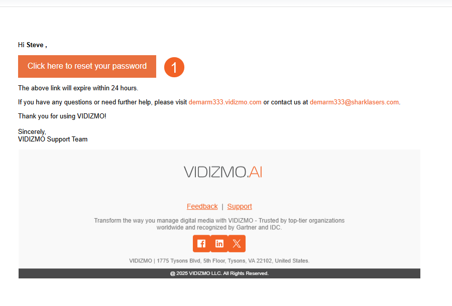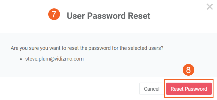 - VIDIZMO displays a confirmation window or modal that shows the name of the user whose password will be reset.