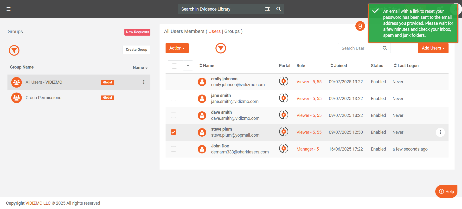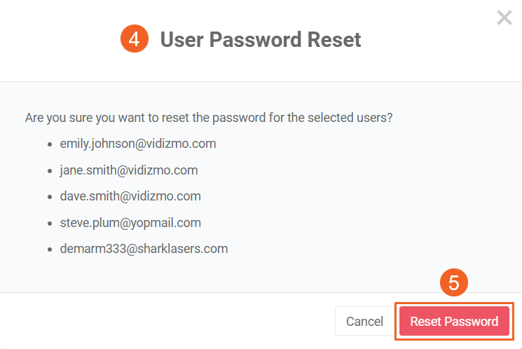 - VIDIZMO displays a confirmation window listing the email addresses of all selected users who will receive the password reset link.