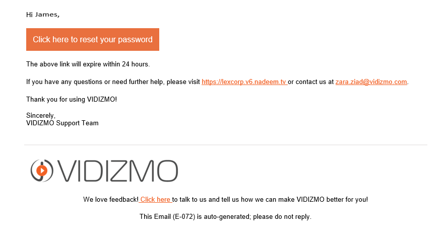 By default, the reset link generated for the user is valid for one day (i.e. 24 hours) after which the link expires automatically. However, this setting can be reconfigured by VIDIZMO. The new password set by a user must comply with the Password Policy defined by VIDIZMO.