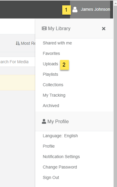 - Click on the User icon on the top right to access Uploaded under My Media.
