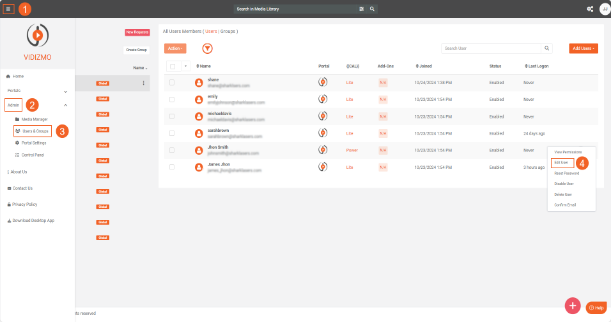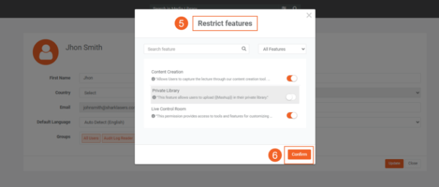 In VIDIZMO, you can restrict specific features for users by editing their profile details within the portal. This allows a user to remain part of a group with limited access to certain features. Customizing feature access will enable you to tailor each user's experience within the portal.