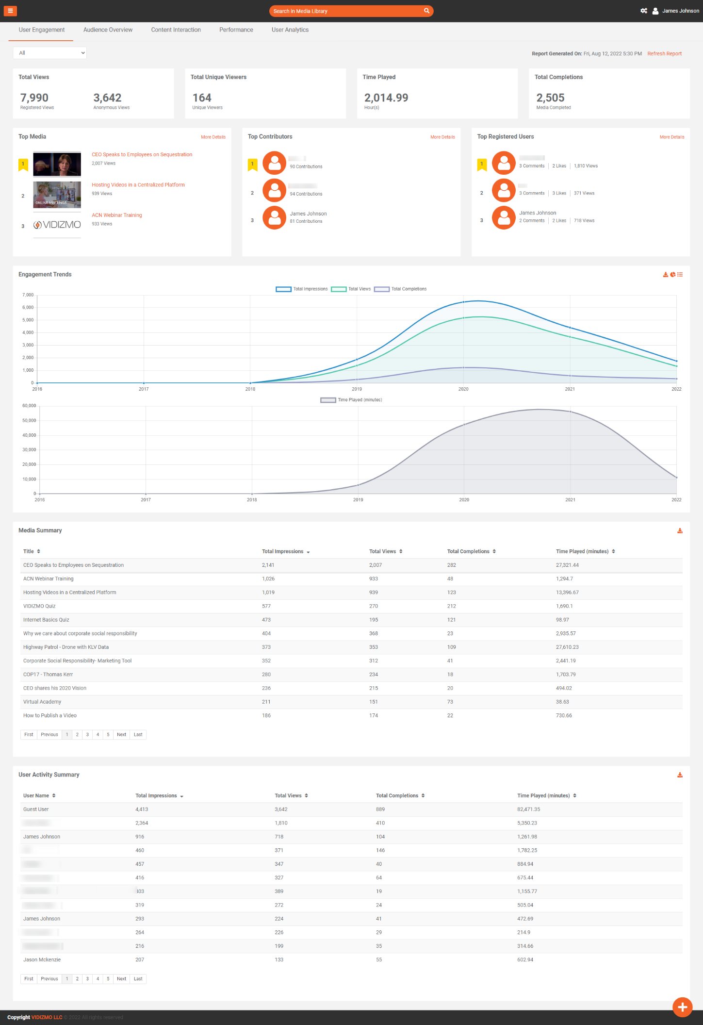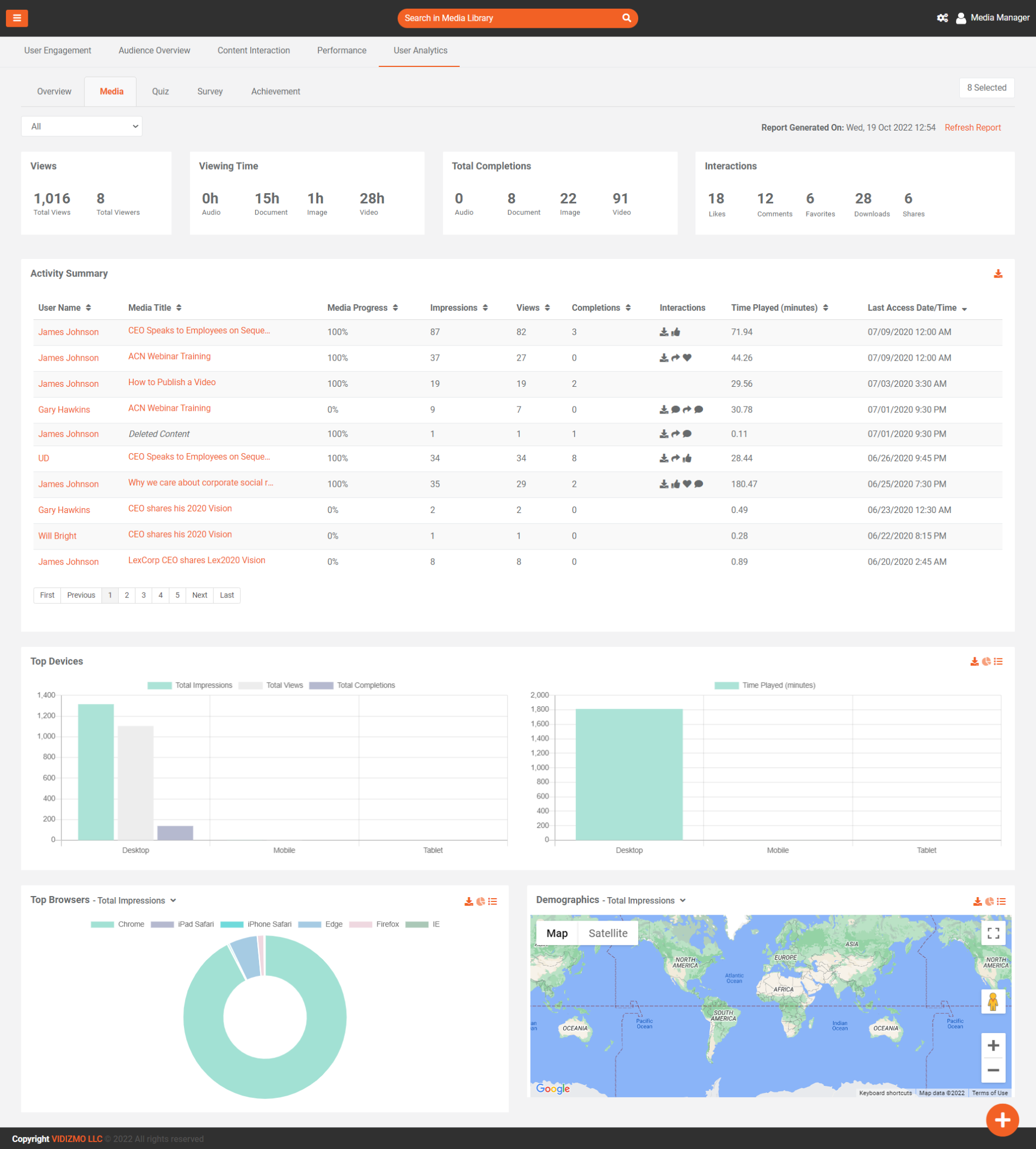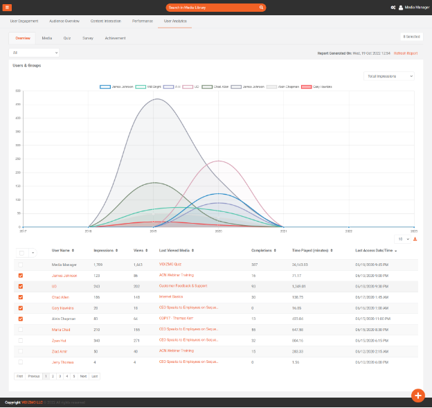 Activity Summary: In this table user can see which user watch/view which media and what interactions are performed by that user on that media. Here, you will find useful infographics about: