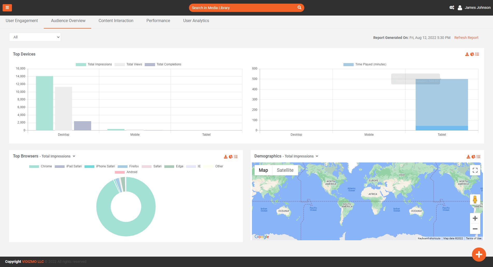Top Devices: This bar-graph will show you the insights of impressions, views, and completion of your portal's content in three major device classes namely Desktop, Mobile, and Tablet by the selected users.