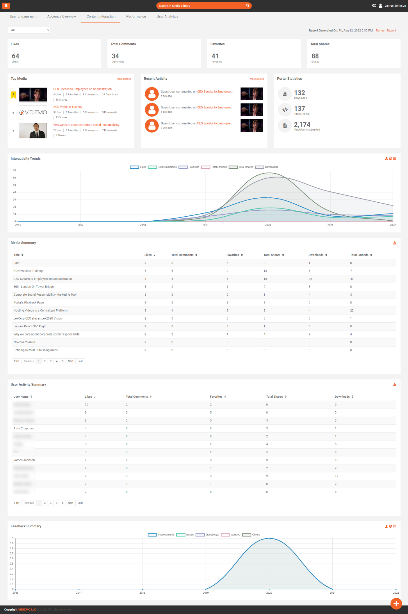 - Media Summary & User Activity: These two tables help you get number of Like, Comments, Favorites, Embeds, Shares, and Downloads for each content and user of the portal.