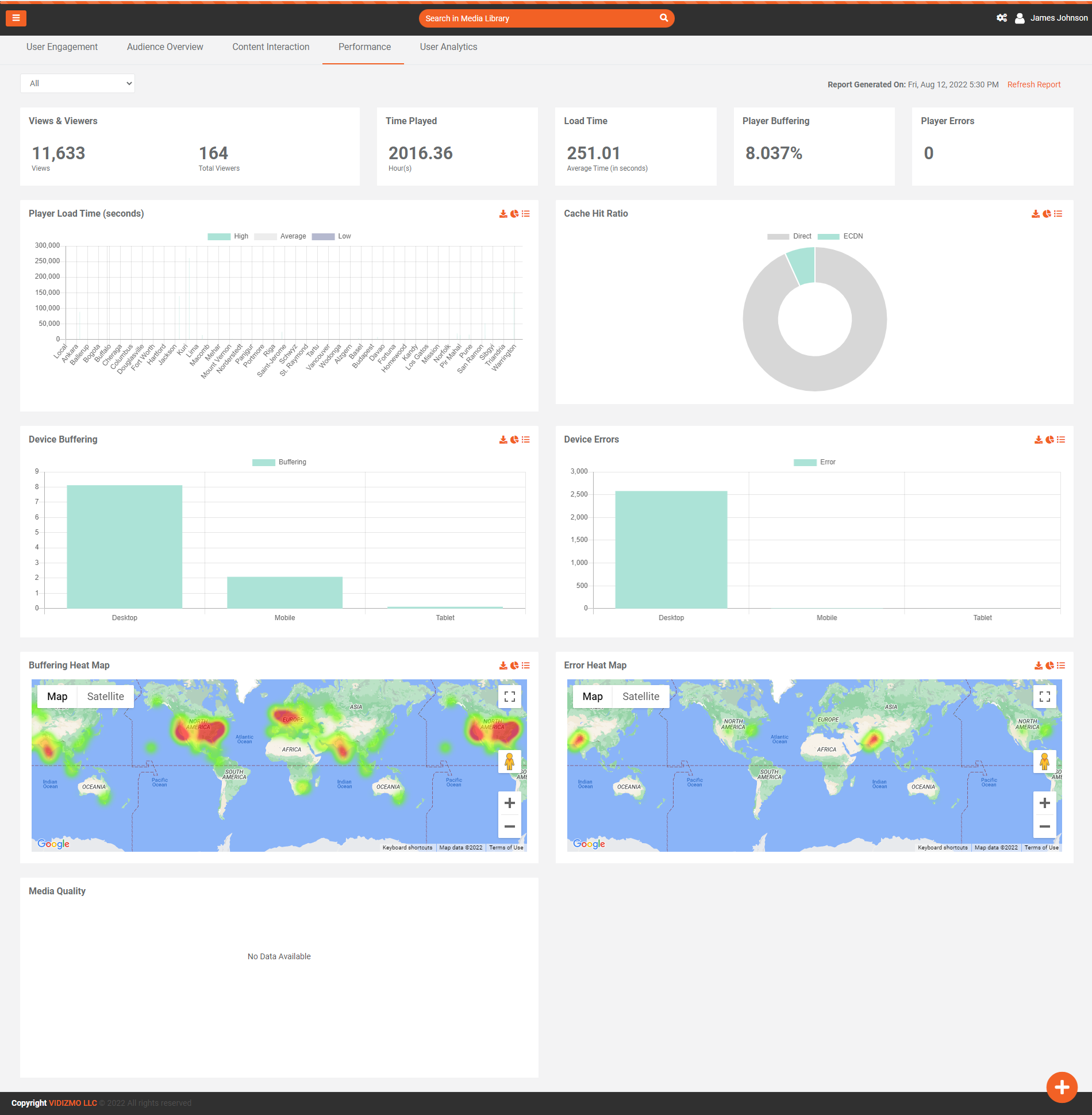 VIDIZMO provides out-of-the-box analytics to its customers for tracking the end-users Quality of Experience (QoE). These analytics cover during and after-delivery statistics for every uploaded media. You can use this expansive list of analytics to assess video delivery experience, identify and resolve any Quality of Service (QoS) issues, thereby improving the QoE for end-users. To learn more about it, read: Understanding Media Quality of Experience (QoE)