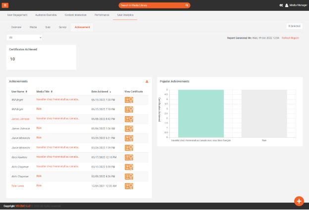 Achievements: In this table user can see which user achieve which certificate. Here, you will find useful infographics about: