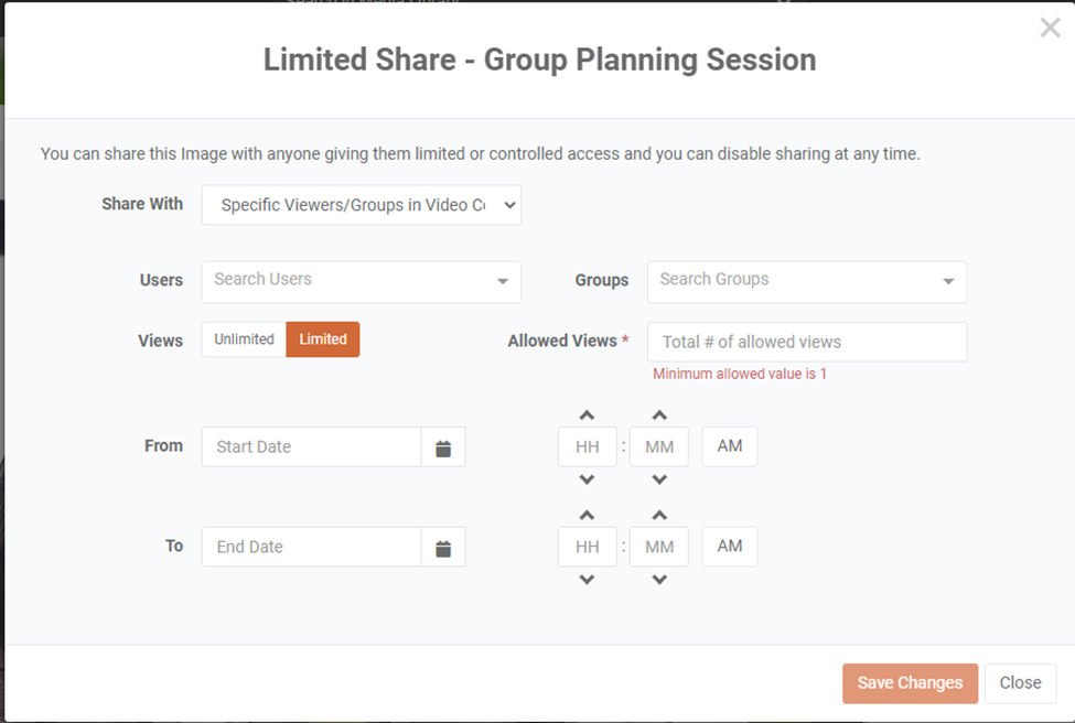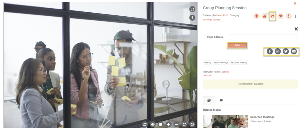 Clicking Share icon, you can use VIDIZMO's advanced sharing options to send media viewership request via email or set Limited Share license on the media for the particular user you are sharing it with. To learn more about it, see: How to Perform Limited Share in EVCM.