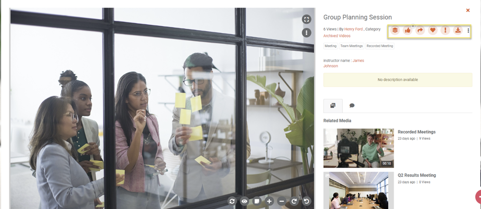 The window icon on the top expands the right pane for you to be able to view information related to the media e.g. its title, description etc., as well as other media on the portal that you might be interested in watching. Using this expansion, you can further share the image with your friends, favorite it to view later in your portal, like it to give your feedback, report an issue or download a local copy of your content file. Whereas the comment icon on the bottom allows you to leave comments on the video.