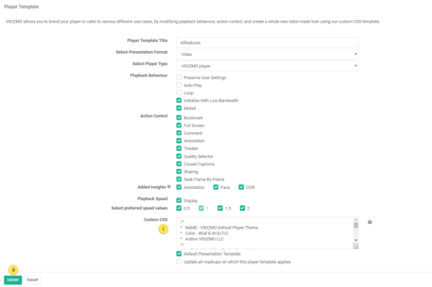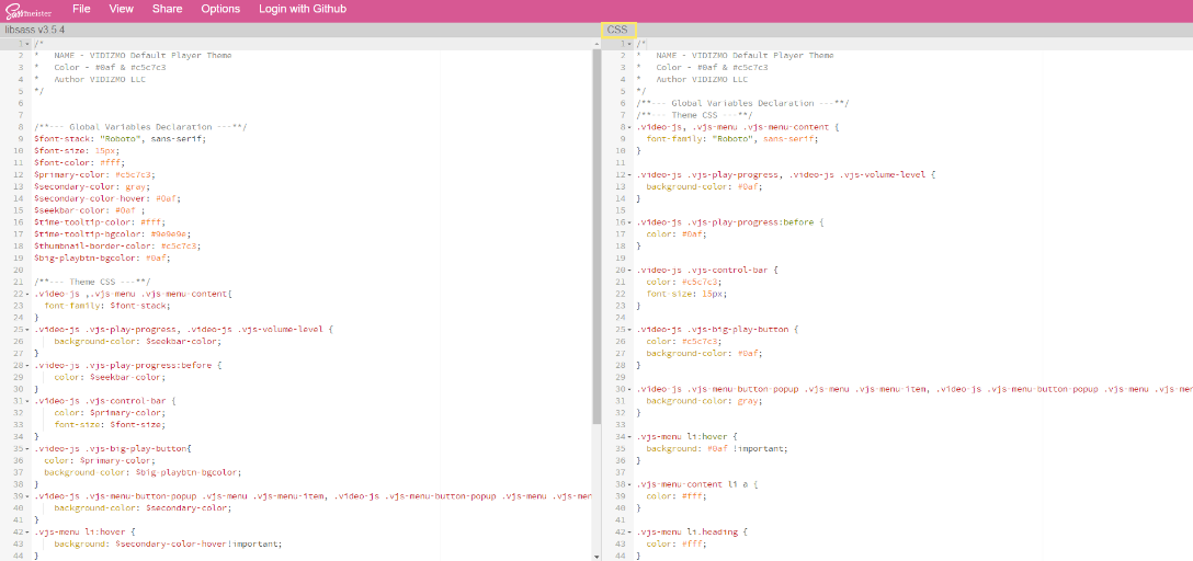VIDIZMO has defined a basic template for branding CSS using SASS framework making it easier for users to modify values and play around the design of the player as they see fit. When the SASS code is processed, it takes the variables we define for the $font-stack and $primary-color etc and outputs normal CSS with our variable values placed in the CSS. After that we need to copy that output CSS and paste it in the custom CSS text box following which we would press the ‘Update' button, and branding will apply in all video players on which that template applies.