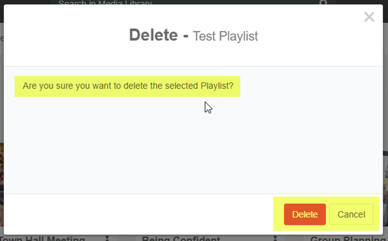 II. A window will popup confirming your selection. If this playlist is shared on other Portals or users, it will become unavailable to them. Click on the Delete button to proceed.