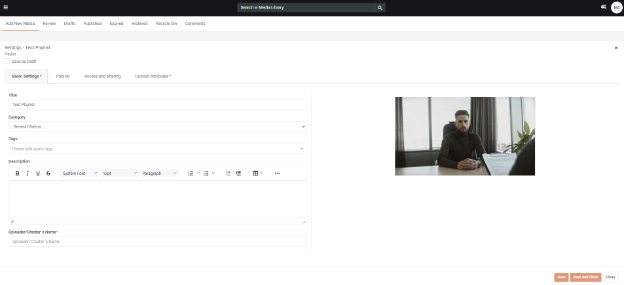 Basic Settings: The user needs to define the Title, Category, Tags, Description and Author's Name. A random thumbnail for the content is set by VIDIZMO. However, a user can upload a custom thumbnail.