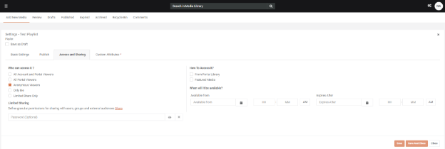 - Access Control: Personalize playlist access based on your requirements. Choose from options such as All Account and Portal Viewers, All Portal Viewers, Anonymous Viewers with link access, Only Me for exclusive ownership, or opt for Limited Sharing to grant specific permissions.