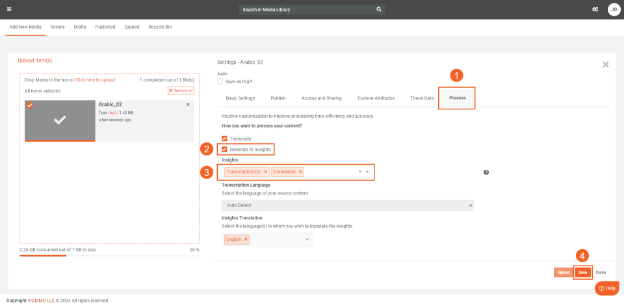 You can translate or transcribe a video or audio file while uploading it using Custom Settings. Users can activate this option by going to Upload Settings, which is present under Library in your Portal Settings. For more information, please refer to How to Custom Upload Media.