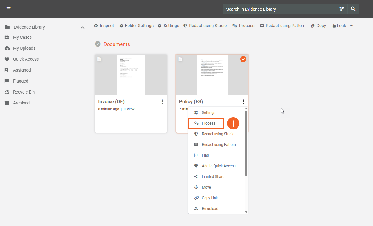 - Navigate to the file(s) you want to translate. Click Process from the overflow menu (or header menu for bulk).