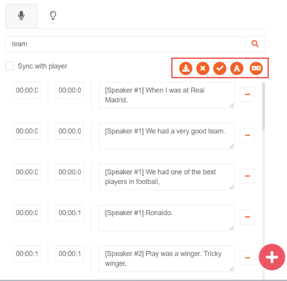 iii. Edit the Transcript: The edit button puts the transcript into an editable mode in which text portions can be edited individually. If a line needs to be removed completely, use the "-" button when the transcript is in edit mode. To cancel editing, click on "x" button, and click on the "✔ " button.