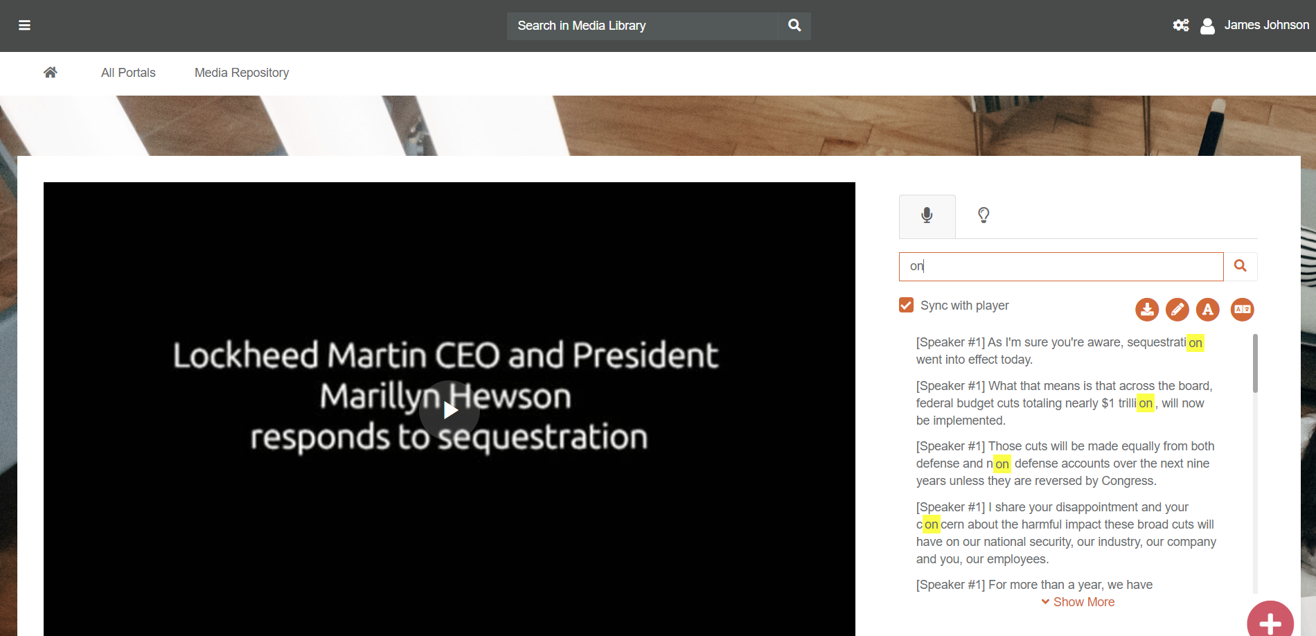 Note: The transcription pane only appears if closed captions are uploaded or automatically generated for that media file.