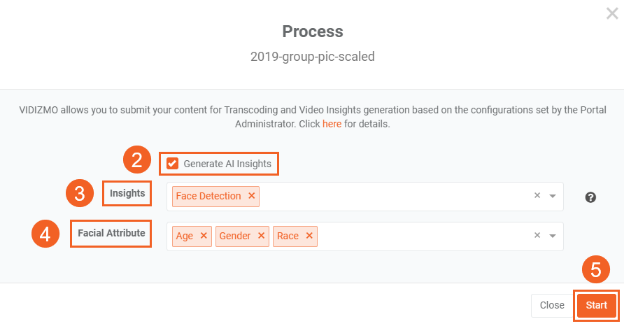 VIDIZMO allows you to generate AI Insights on your content as uploaded to your Portal. This is done by turning on Automatic Processing in your Portal's App Settings. You can use automatic processing to generate face attribute insights for images and videos uploaded to your Portal automatically.