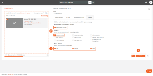 Once you have chosen a file for upload, navigate to the Process Tab and opt for "Generate AI Insights with Face Detection.