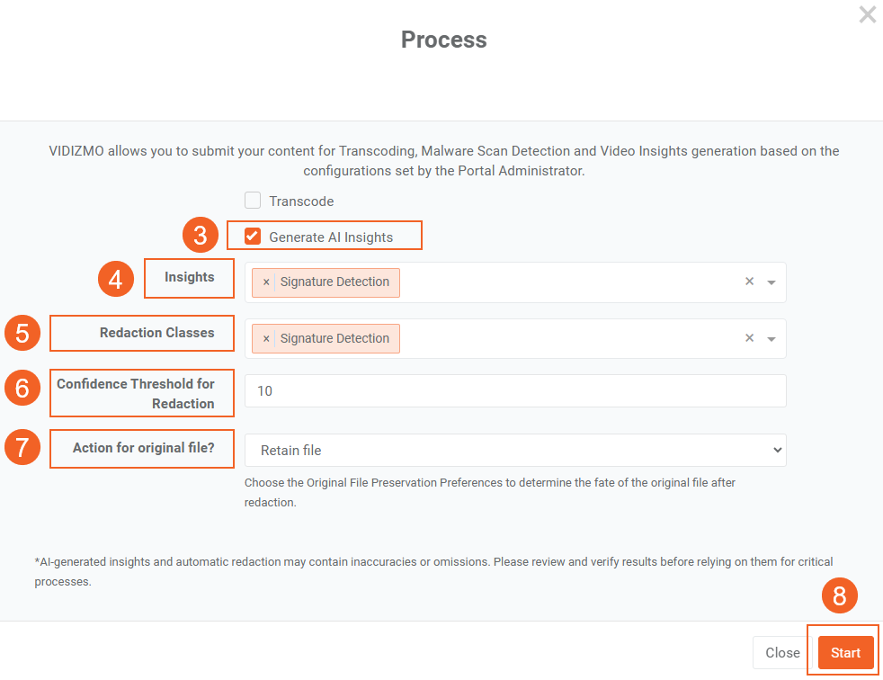 If you've set up automatic processing in the VIDIZMO Vision Indexer, the system automatically initiates the appropriate workflow (Detection or Redaction)whenever files are uploaded to the portal. Based on your configuration in the Vision Indexer app, the file will be processed to either detect or redact signatures during the upload process.