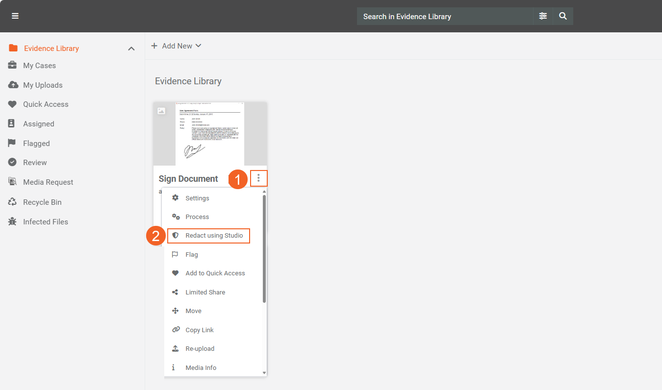 In Studio Space, you can detect and redact signatures either manually or automatically. Manual redaction allows you to review detected signatures and selectively redact specific instances from your content as needed.