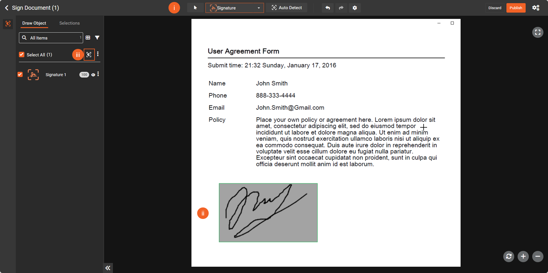 iii. Review the detected signatures, select the ones you want to redact, choose the Redact icon, and then select Publish to save and finalize the redacted file.