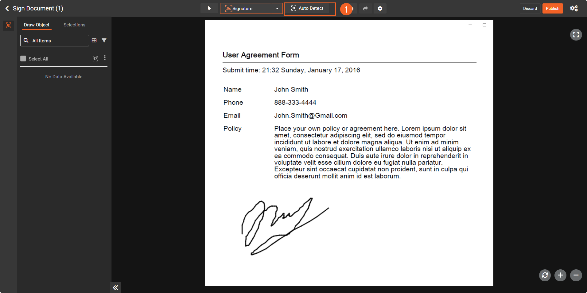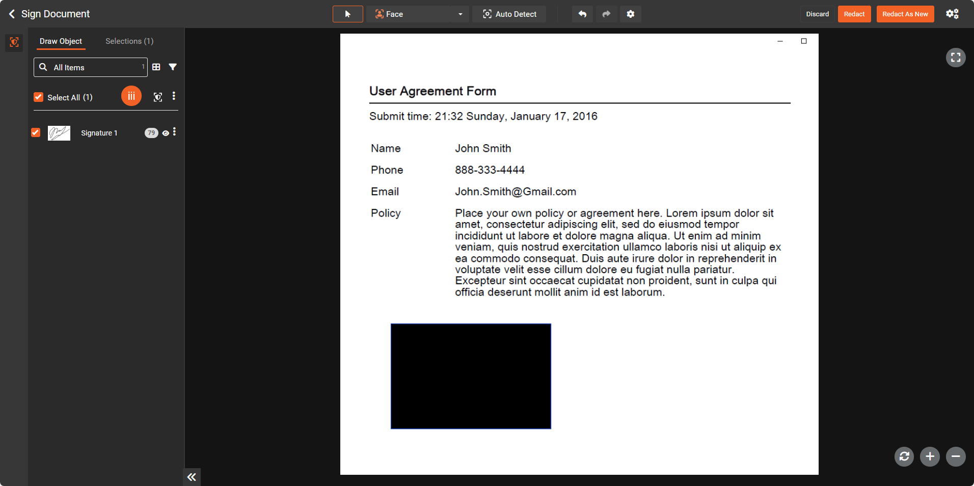 i. From the header, select the Signature Detection class. ii. Draw a bounding box around the signature you want to redact. The object appears under the selected tab. iii. Select the detected object, then choose Redact to apply the redaction.