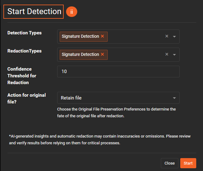 In addition to automatic processing, you can perform on-demand signature detection during content upload or via the Process Modal. Once detected, signature redaction and detection are performed simultaneously.