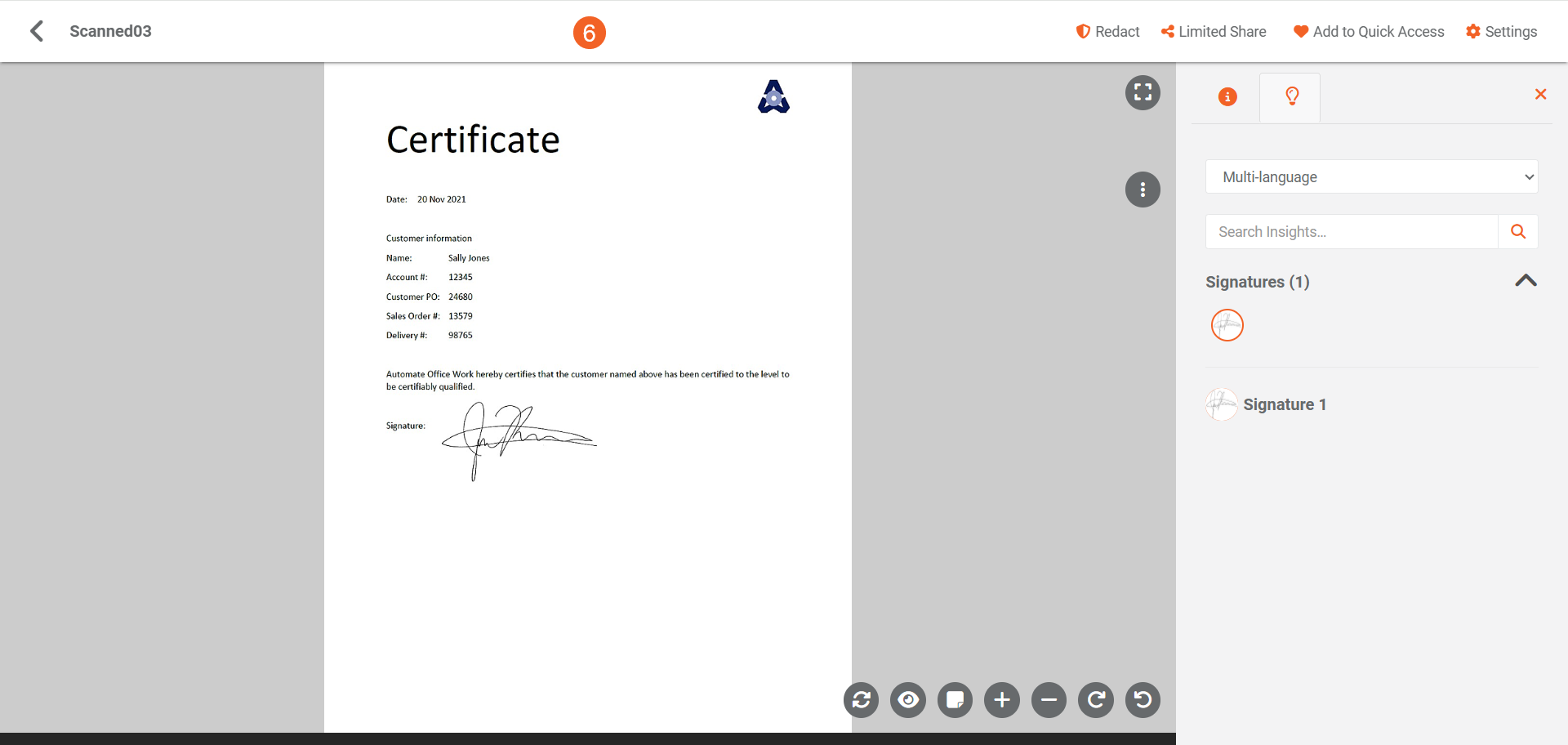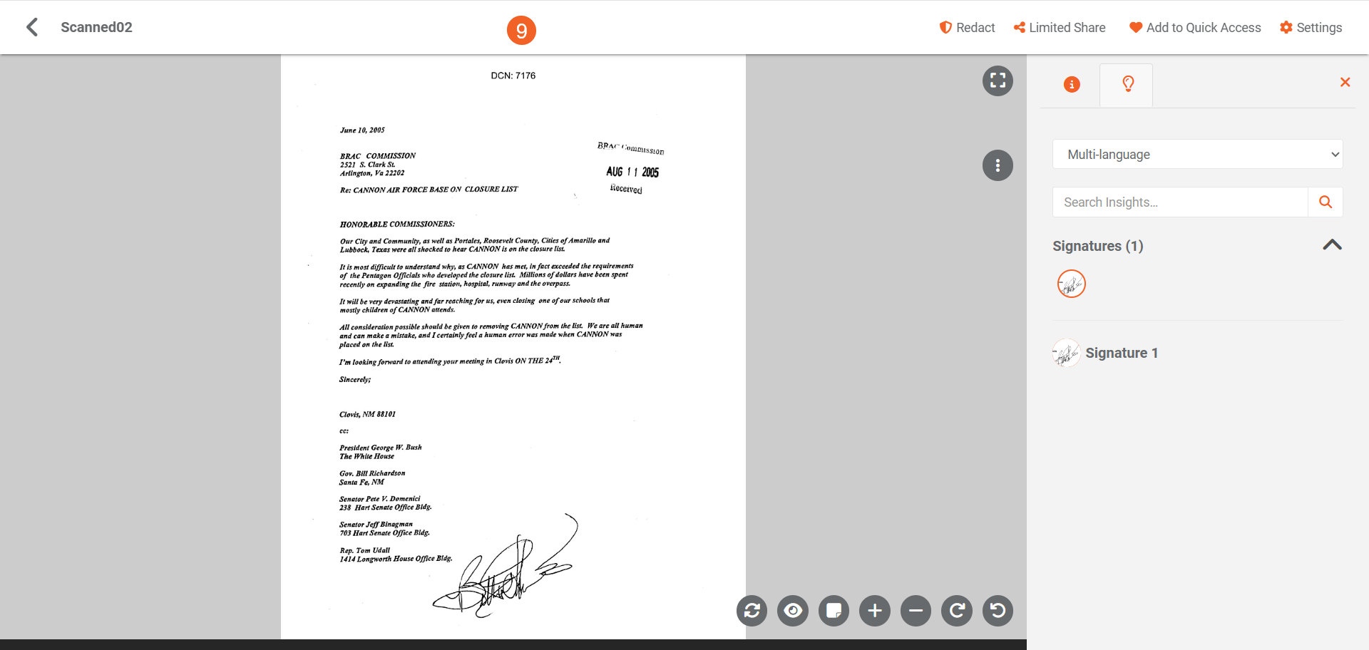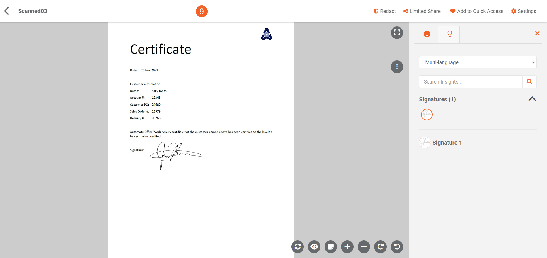 Once detected, the generated signature metadata can be used to redact signatures to help ensure privacy and security, or to enable a search for content in your Portal that contains signatures.