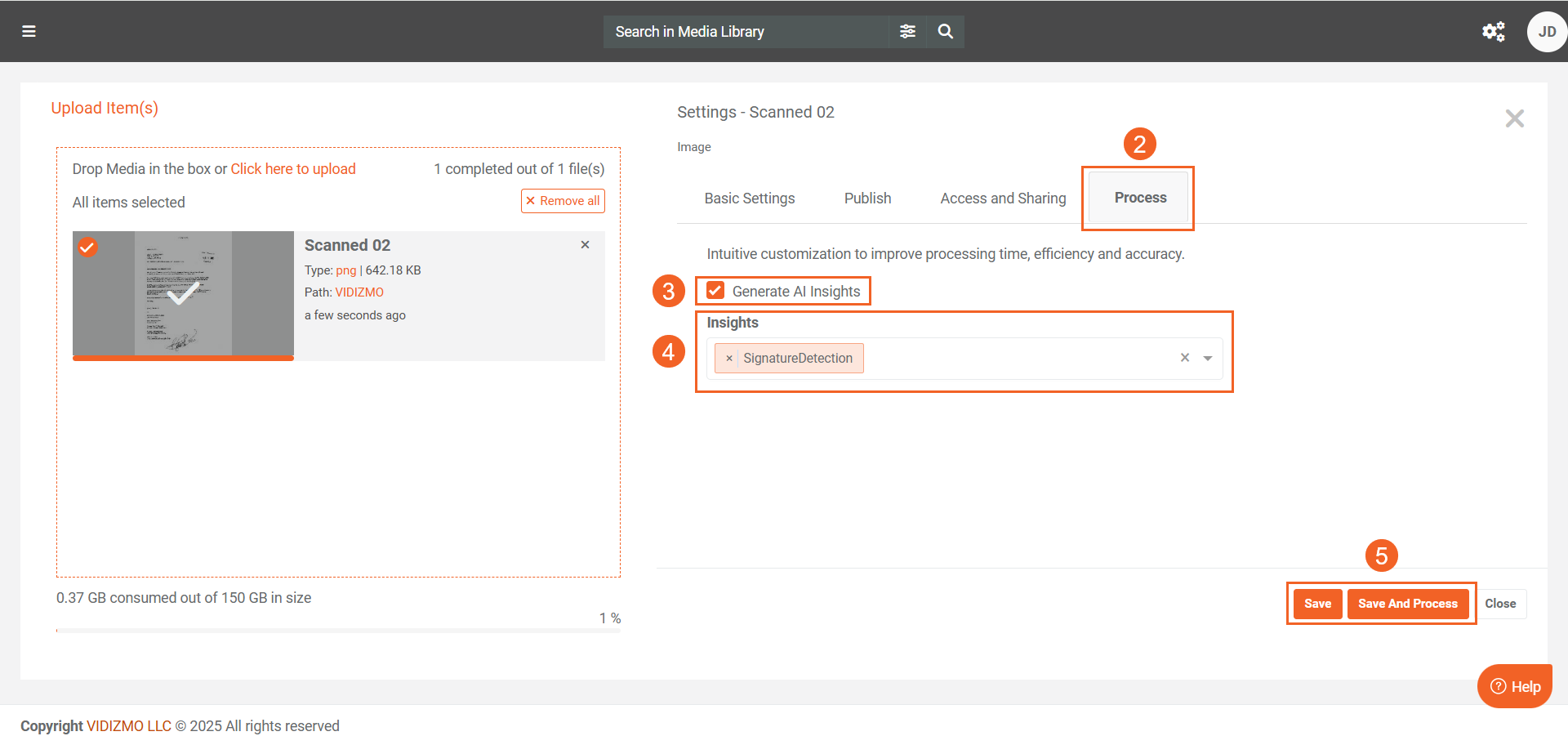 - You can also perform bulk processing by selecting multiple files and using the Process option from the header menu.