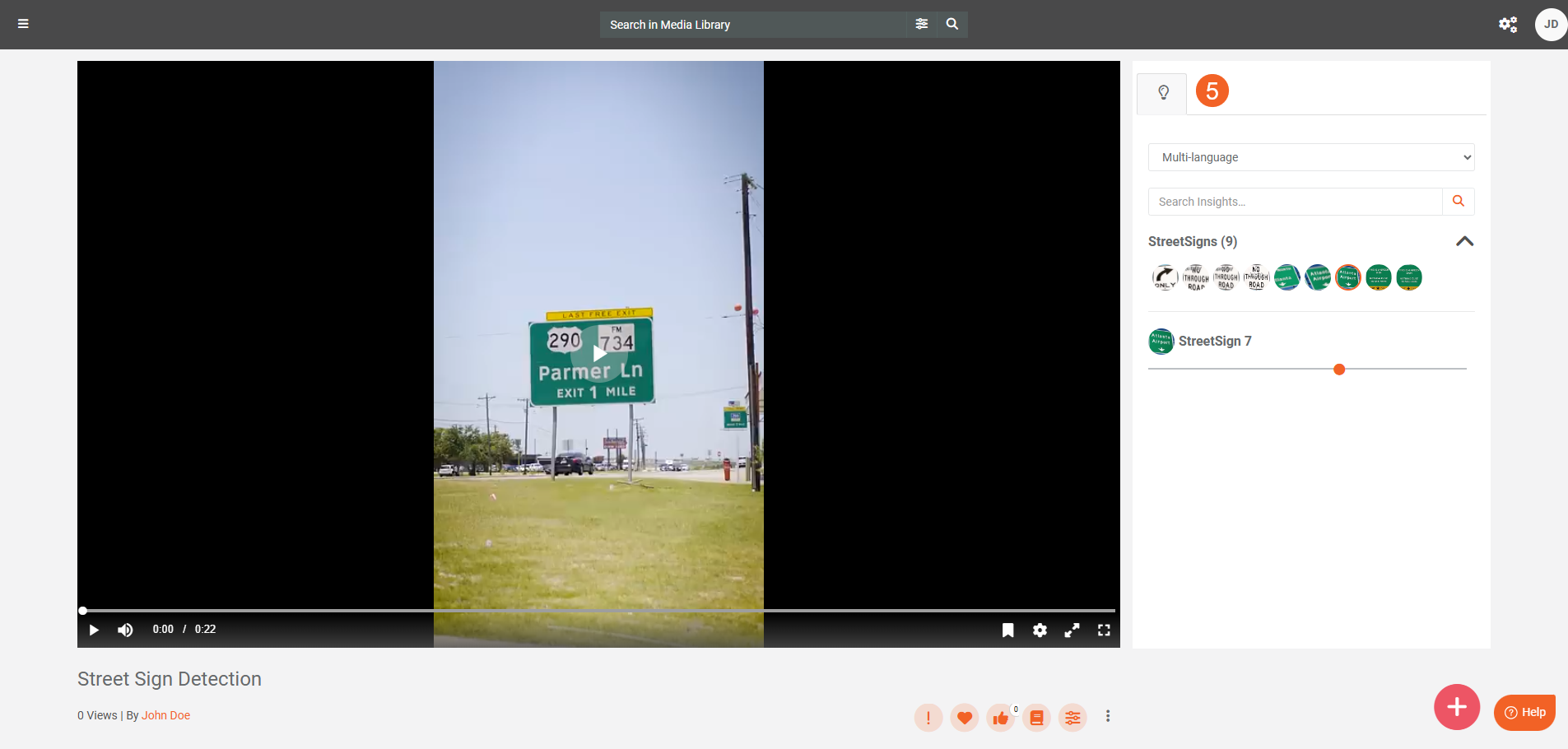 Street sign detection identifies and locates street and highway or road signs in your content. Use VIDIZMO Vision Indexer to process images and videos and display these detections as insights on the playback page. Tou can then search for items that contain street signs or use these detections as inputs for redaction workflows.